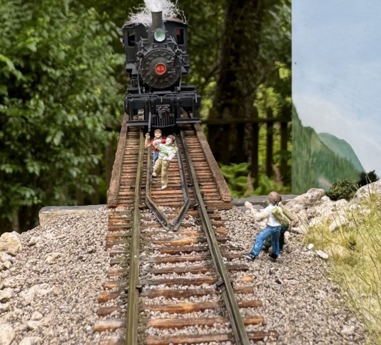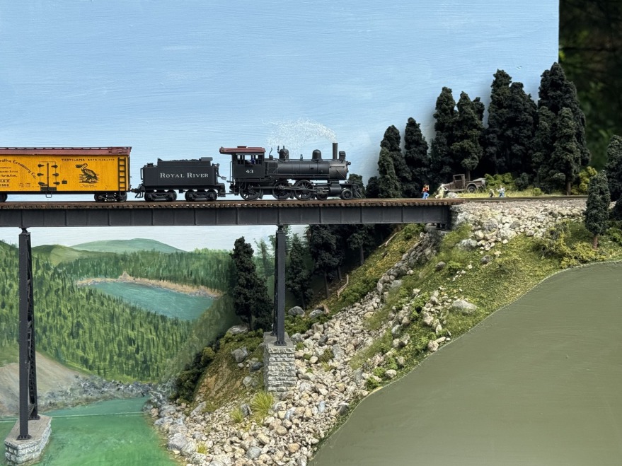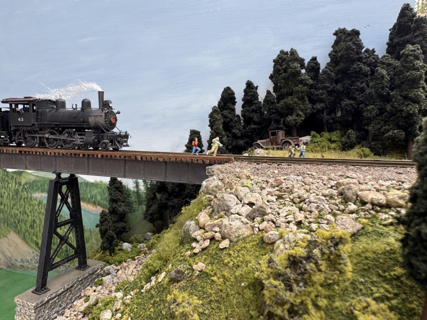 Eben took three months to build this 2' x 1' diorama. He made it very tall to eliminate the illusion thant the boys could jump to safety. The terrain is plaster soaked paper towels over a cardboard lattice. There are 29 pine trees in the scene and 300 metric tons of stone. The backdrop is entirely hand painted.